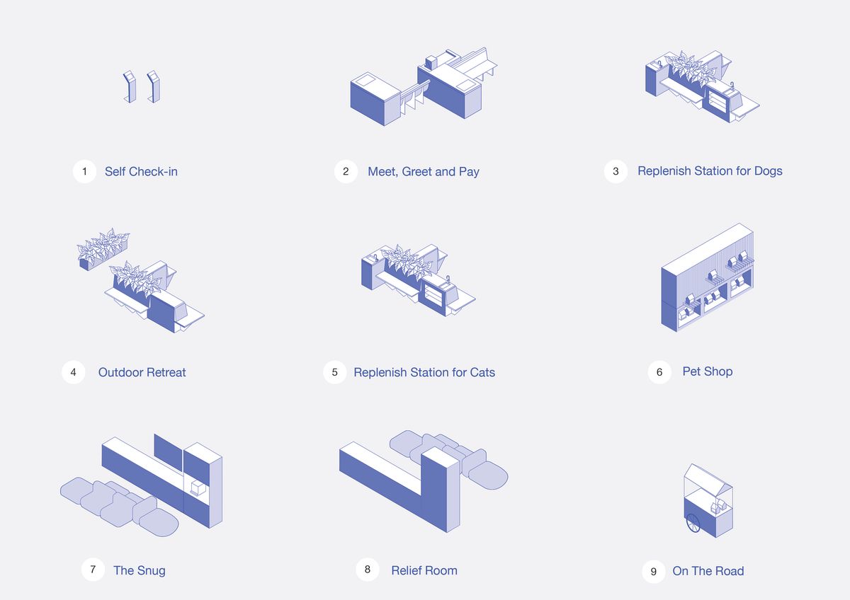The kit-of-parts includes an outdoor space, a shop, and a snug, all of which have been combined to create an ideal customer journey. The designs intend to separate cats and dogs upon arrival and offer a variety of digital and well-being touchpoints such as music, biophilia, proactive check-in terminals, and refreshment stations with elevated platforms for cats.